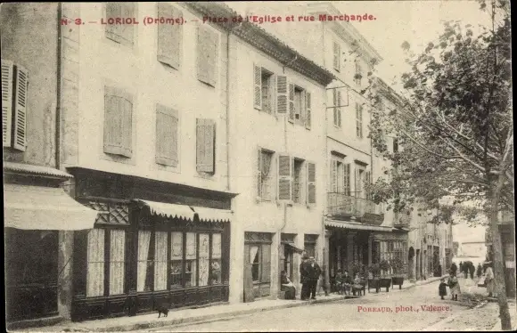 Ak Loriol Drôme, Place de l'Eglise, Rue Marchande