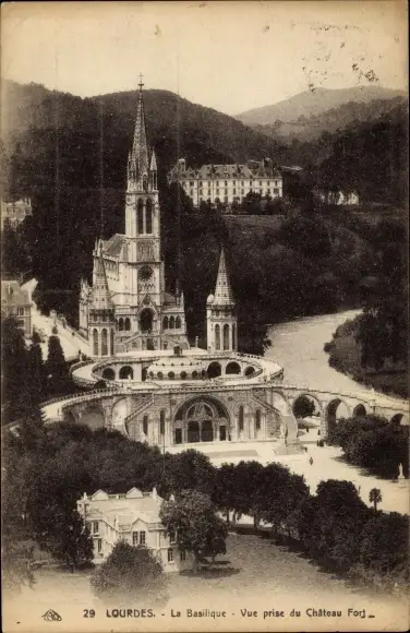 Ak Lourdes Hautes Pyrénées, La Basilique et la Gare, Château