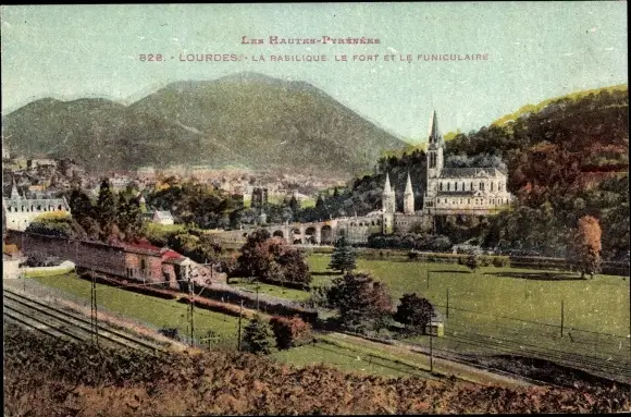 Ak Lourdes Hautes Pyrénées, La Basilique, le Fort et le Funiculaire