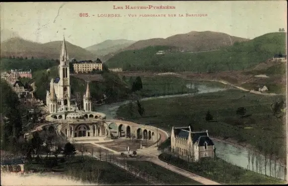 Ak Lourdes Hautes Pyrénées, Vue sur la Basilique, Kirche, Fluss