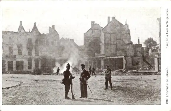 Ak Louvain Louvain Flämisch-Brabant, Brand 1914, Place de la Gare