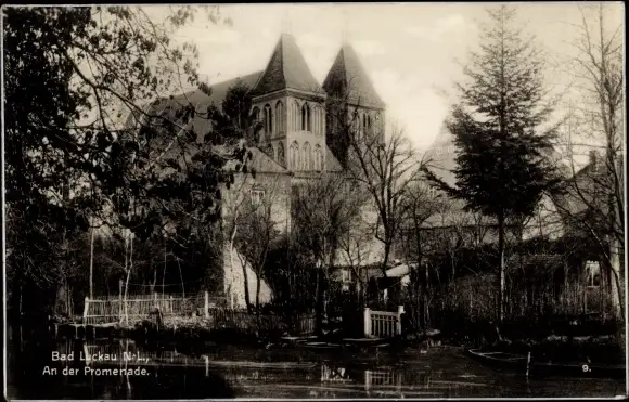 Ak Luckau in der Niederlausitz, Partie an der Promenade, Kirche