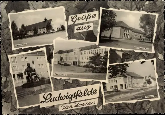 Ak Ludwigsfelde in Brandenburg, Klubhaus JWL, Oberschule, Postamt, Denkmal