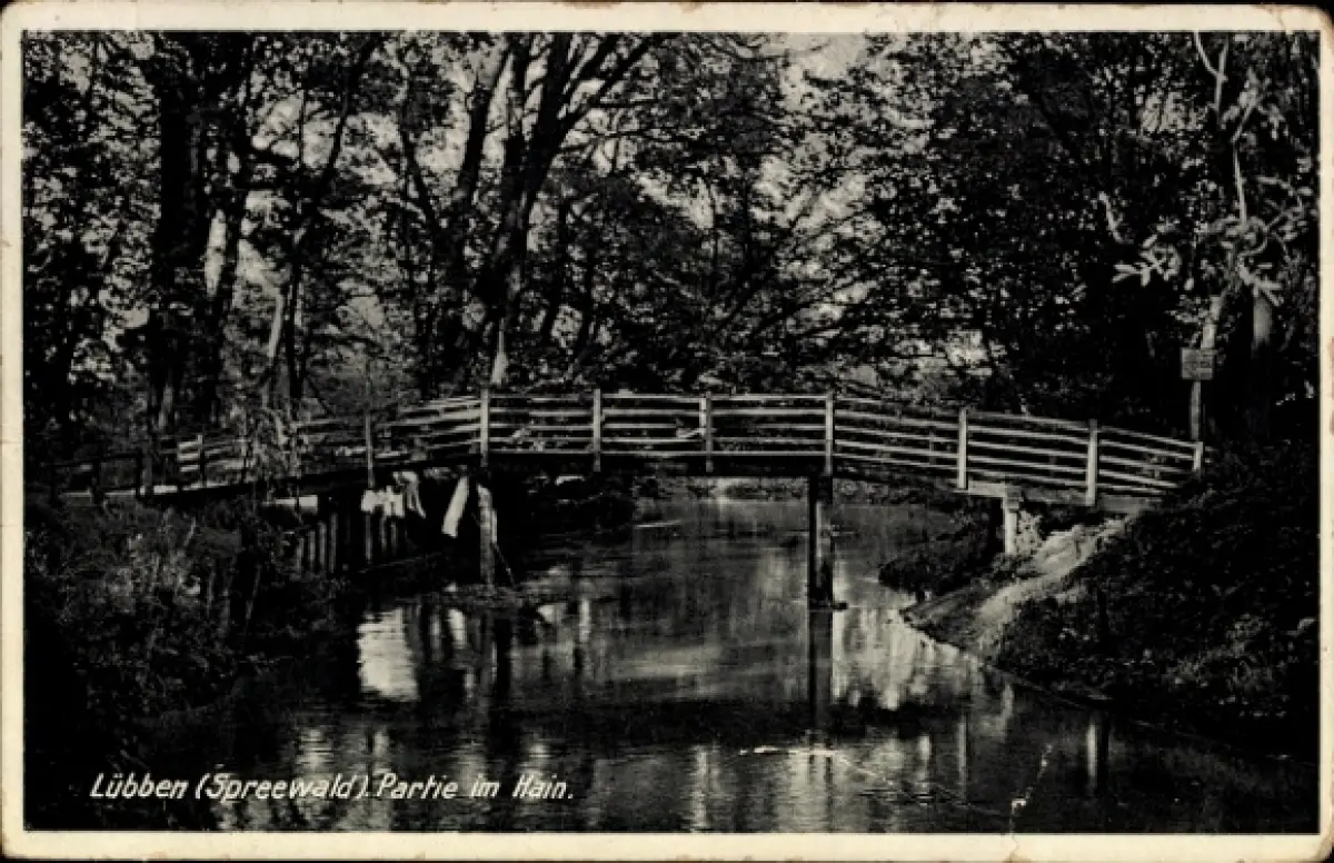 Ak Lübben im Spreewald, Brücke über Wasser, Bäume, Text 'Lübben (Spreewald) Partie im Hain.'