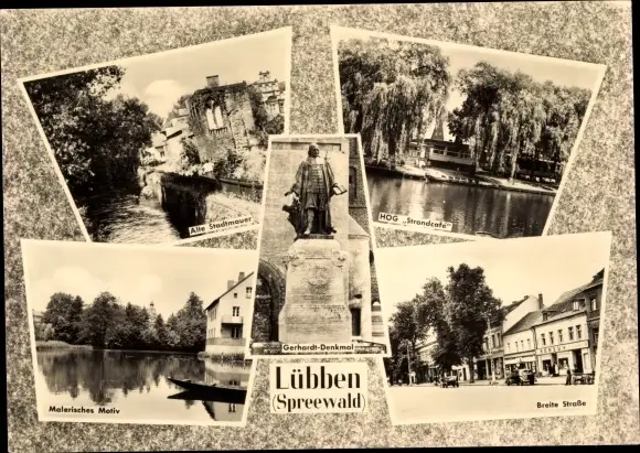 Ak Lübben im Spreewald, HOG Strandcafé, Breite Straße, Gerhardt Denkmal, Stadtmauer