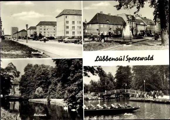 Ak Lübbenau im Spreewald, Neustadt, Markt, Stadtpark, Hafen