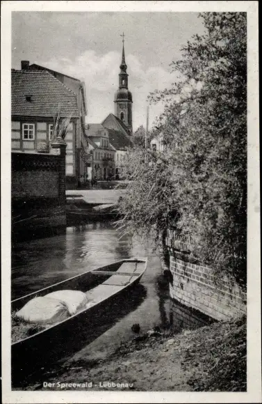 Ak Lübbenau im Spreewald, Partie am Wasser, Boot am Ufer, Kirchturm