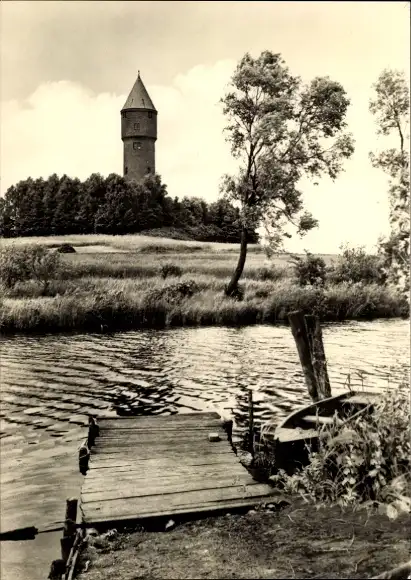 Ak Lübz in Mecklenburg, Wasserturm, Steg, Ruderboot