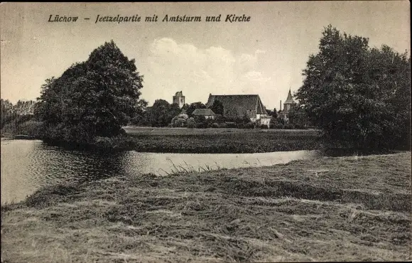 Ak Lüchow im Wendland, Jeetzelpartie mit Amtsturm und Kirche