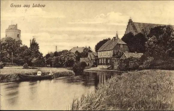Ak Lüchow im Wendland, Teilansicht, Turm, Boot