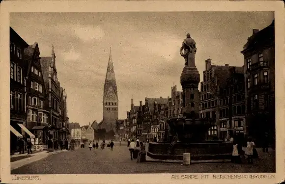 Ak Lüneburg in Niedersachsen, Am Sande mit Blick zur Johanniskirche, Reichenbachbrunnen