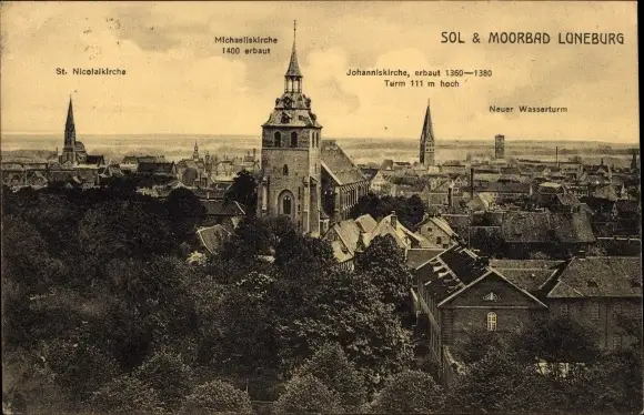 Ak Lüneburg in Niedersachsen, St. Nicolaikirche, Michaeliskirche, Johanniskirche, Neuer Wasserturm