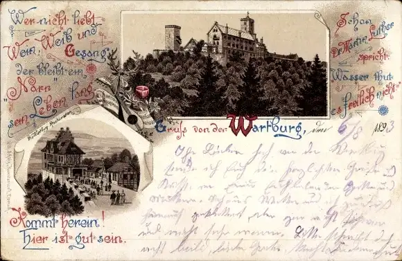 Ak Lutherstadt Eisenach in Thüringen, Wartburg, Burgansicht, Text über Wein, Weib und Gesang, ein