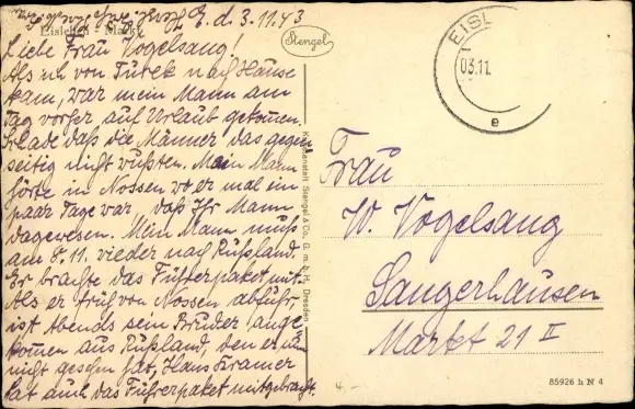 Zustand, siehe Scan, gelaufen, 1943- Stengel 85926 - ca 9 cm X 14 cm