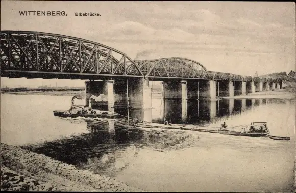 Ak Lutherstadt Wittenberg, Elbebrücke, Schleppschiff mitTransportschiff