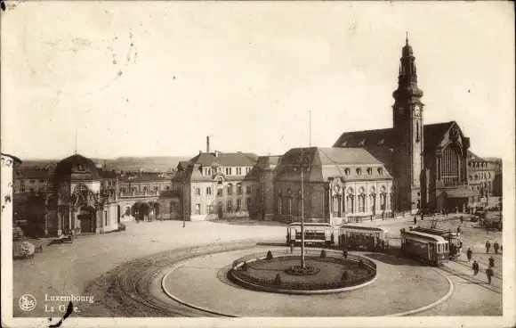 Ak Luxembourg, Straßenbahn fährt um Rondel am Bahnhof vorbei