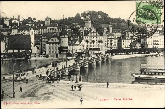 Ak Luzern Stadt Schweiz, Blick über die Neue Brücke zur Stadt, Straßenbahn