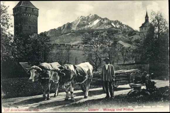 Ak Luzern Stadt Schweiz, Musegg und Pilatus, Rindergespann mit Fuhrwerk