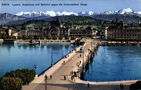 Ak Luzern Stadt Schweiz, Seebrücke und Bahnhof gegen die Unterwaldner Berge