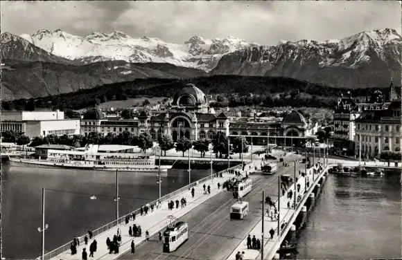 Ak Luzern Stadt Schweiz, Seebrücke und Bahnhof gegen die Unterwaldner Berge
