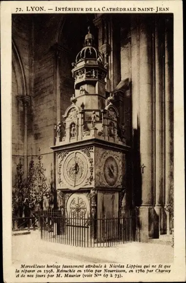 Ak Lyon Rhône, Kathedrale St. Jean, Innenansicht, Uhr