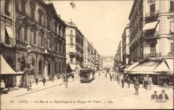 Ak Lyon Rhône, La Rue de la Republique et la Banque de France, Straßenbahn