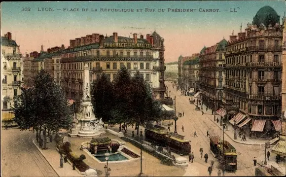 Ak Lyon Rhône, Place de la Republique, Rue du President Carnot, Straßenbahnen
