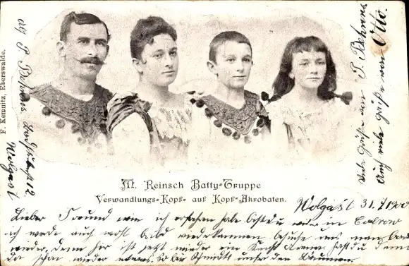 Ak M. Reinsch Batty-Truppe, Verwandlungs-Kopf und Kopf-Akrobaten