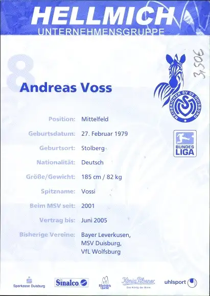 Ak MSV Duisburg 03 04, Fußballer Andreas Voss, Portrait, Autogramm, Reklame, Hellmich