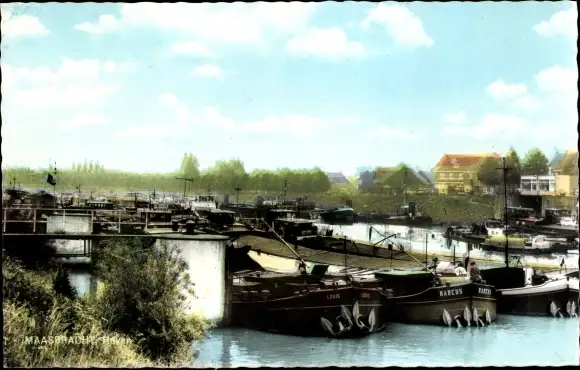 Ak Maasbracht Limburg Niederlande, Haven, Boot Marcus, Hafenpartie