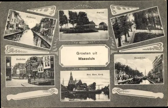 Ak Maassluis Südholland, Zuidvliet, Ned. Herv. Kerk, Noordvliet, Station