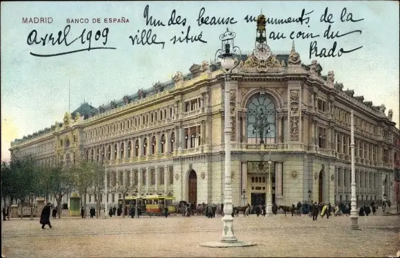 Ak Madrid Spanien, Banco de Espana, Straßenbahn