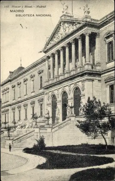 Ak Madrid Spanien, Biblioteca Nacional, monumentales Treppen, Architektur