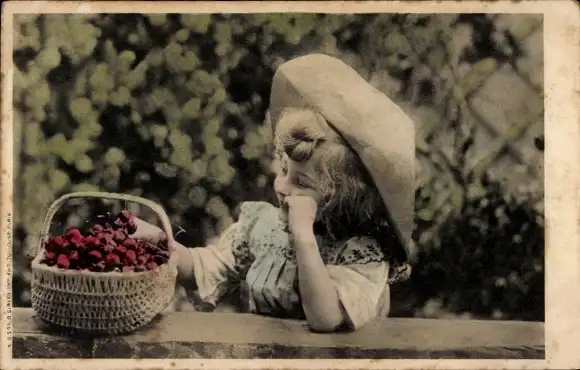 Ak Mädchen-Porträt, Hut, Früchte im Korb