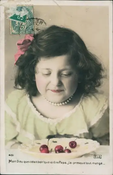 Ak Mädchen am Tisch, Kirschen auf dem Teller, Perlen