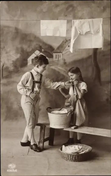 Ak Mädchen beim Wäschewaschen, Junge, Liebespaar, Wäscheleine