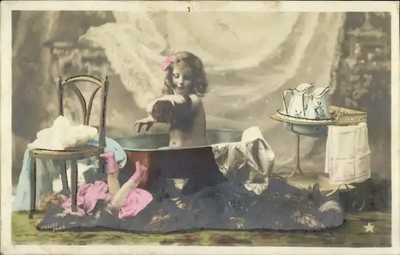Ak Mädchen in der Badewanne, Puppe liegt davor