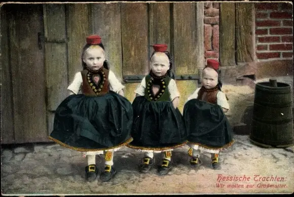 Ak Mädchen in hessischen Trachten, Wir wollen zur Großmutter
