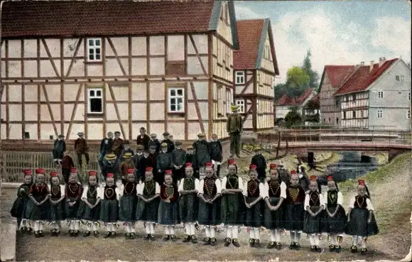 Ak Mädchen in hessischen Trachten, Wohnhäuser
