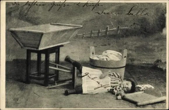 Ak Mädchen ist mit Hocker umgefallen, Waschbottich