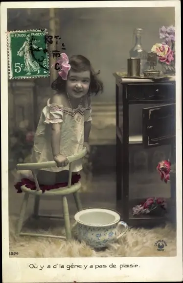 Ak Mädchen kniet auf einem Stuhl, Nachttopf