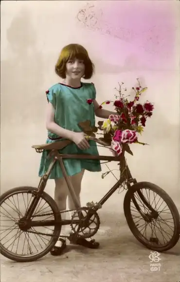 Ak Mädchen mit Fahrrad, Blumenstrauß