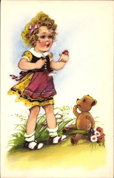 Ak Mädchen mit Marienkäfer, Teddy, Wiese, Blumen