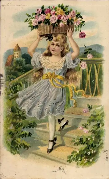 Ak Mädchen mit Rosen in einem Korb