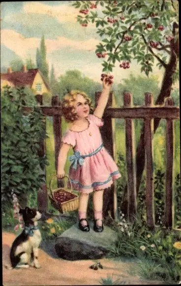 Ak Mädchen pflückt Früchte, Katze, Korb