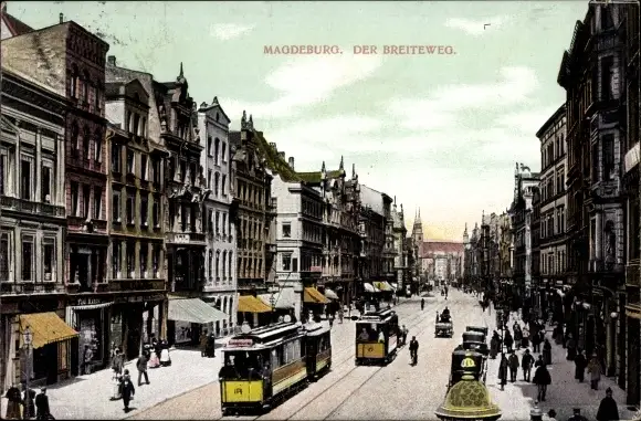 Ak Magdeburg, Breiteweg, Straßenbahnen, Geschäfte