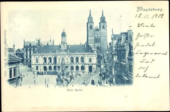 Ak Magdeburg an der Elbe, Alter Markt, Kirchtürme, Straßenbahn
