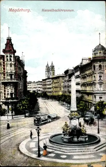 Ak Magdeburg an der Elbe, Hasselbachbrunnen, Straßenbahn