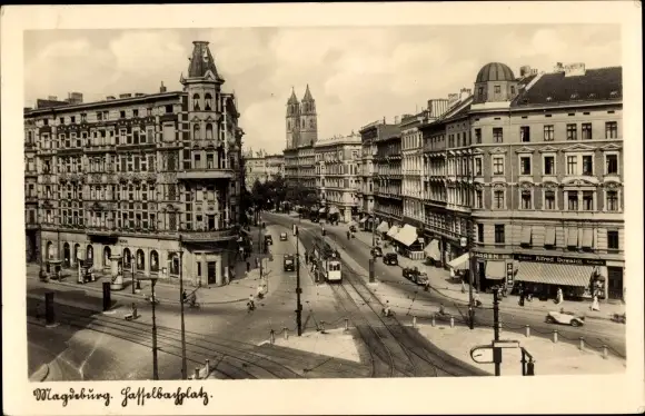 Ak Magdeburg an der Elbe, Hasselbachplatz, Geschäfte, Straßenbahn
