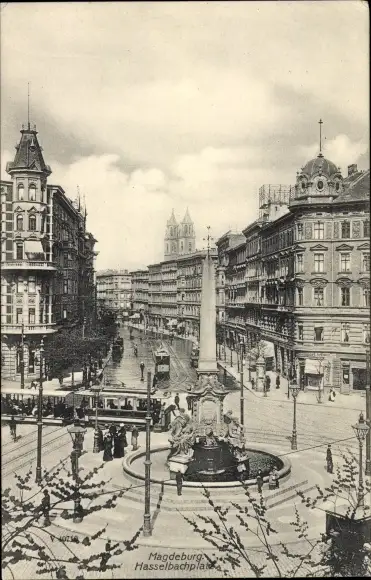 Ak Magdeburg an der Elbe, Hasselbachplatz, Säule, Straßenbahn